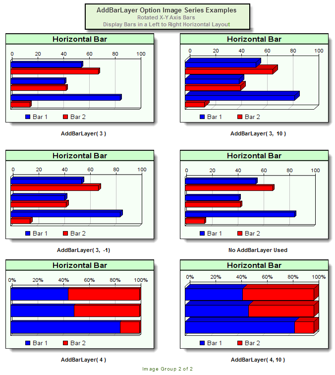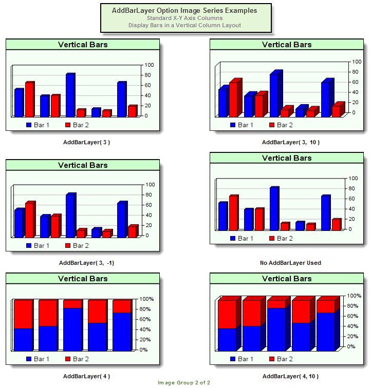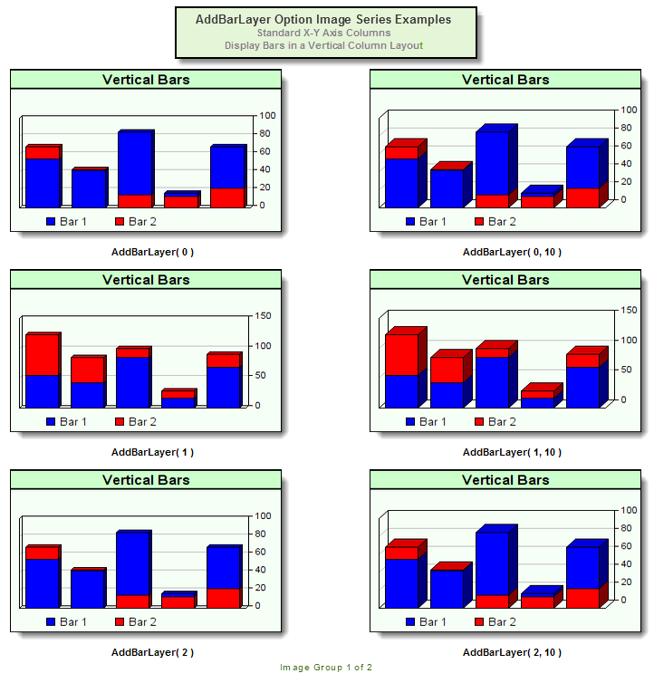 This method is not required with bar charts, but when it is used the first parameter provides five methods that change the way bar are displayed on a chart. Its second parameter provides control over the chart's 3-dimensional appearance. Applying a bar display modification doesn't require the user to change the 3D effect of the chart, but both parameters can be applied at the same time.