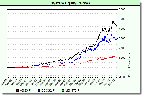 ' ~~~~~~~~~~~~~~~~~~~~~~~~~~~~~~~~~~~~~~~~~~~~~~~~~~~~~~~~~~~~~~ ' Create a chart area that is 80-Pixels wide, and 500-Pixels high chart.NewXY("System Equity Curves", iChartWidth, iChartHeight ) ' Number of data points to place on the chart elementCount =test.currentDay ' Place a scale label identifying the vertical scale information chart.SetAxisTitles("","Percent Gain/Loss") ' Set X-Axis Dates to use beginning of month chart.SetxAxisDates(AsSeries(DateSeries), elementCount, 4) ' Plot a Black line at the chart's Y-Axis Zero location chart.AddLineSeries(AsSeries( systemEquity ), elementCount,"", 0 ) ' ~~~~~~~~~~~~~~~~~~~~~~~~~~~~~~~~~~~~~~~~~~~~~~~~~~~~~~~~~~~~~~ ' Examine each system in the Simulation Suite For systemIndex = 1 TOtest.systemCount ' Access each system in the suite test.SetAlternateSystem( systemIndex ) ' Capture the daily exchange net equity rate change of ' ' each system in the Suite For i = 1 TO elementCount ' Calculate the total equity net percentage change between ' ' Test dates and store that information in a BPV system equity series. systemEquity[i]=(alternateSystem.totalEquity[ elementCount - i ] _ /alternateSystem.totalEquity[ elementCount - 1 ]- 1 )* 100 Next' i ' ~~~~~~~~~~~~~~~~~~~~~~~~~~~~~~~~~~~~~~~~~~~~~~~~~~~~~~~~~~~~~~ ' Assign each system net rate change to a specific color plotColor = ColorItem[ systemIndex ] 'OR ' Consider a random number color assignment ' BLUE GREEN RED 'plotColor = ColorRGB( Random(255), Random(255), Random(255) ) ' Place this system's test-date total equity percentage net change ' value in the chart space using the new color chart.AddLineSeries(AsSeries(systemEquity), elementCount, _ alternateSystem.name, plotColor ) Next' systemIndex ' ~~~~~~~~~~~~~~~~~~~~~~~~~~~~~~~~~~~~~~~~~~~~~~~~~~~~~~~~~~~~~~ ' When all the system's equity changes are display as new chart ' lines, save the image information as a file. chart.Make( sFilePath2 ) ' ~~~~~~~~~~~~~~~~~~~~~~~~~~~~~~~~~~~~~~~~~~~~~~~~~~~~~~~~~~~~~~