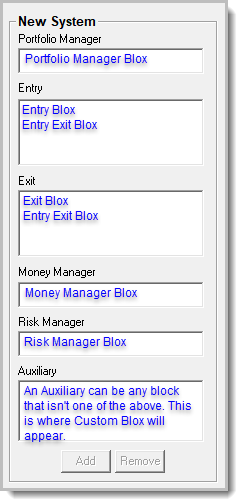 Trading blox has six Blox Types designed to handle different system responsibilities needed to test most of trading ideas. Blox assigned to a Global Suite System are restricted in which of the possible Blox script sections allowed to execute. |