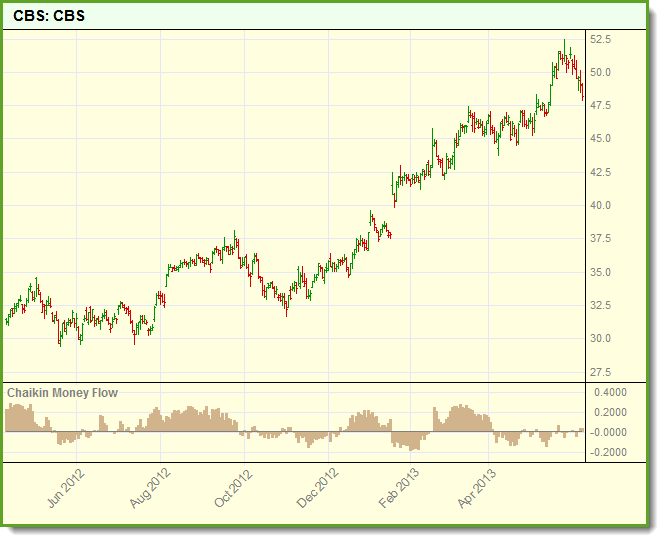 Chaikin Money Flow indicator theory tells us accumulation is happening when a stock with a volume increase has a Close price near the high of the market. Distribution happens with an increase in volume when the stock closes near the low of the price-bar.