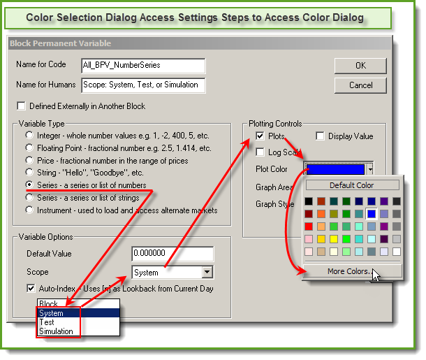 All BPV Series will provide access to the Trading Blox Color Selection Dialog when the BPV series uses a System, Test or Simulation Scope setting with a BPV numeric series.