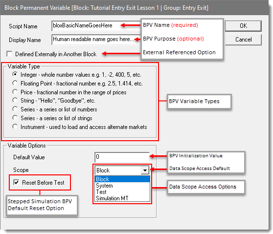 Trading Blox Builder has now separated these to concepts, so you can set the scope separately from this reset process by changing the status of the "Reset Before Test" option in the dialog where that variable is created. Keep in mind as we talk about variables and values and scopes, each thread gets it’s own set of variables. This means a simulation variable is only visible in the thread were it is created for the step test.