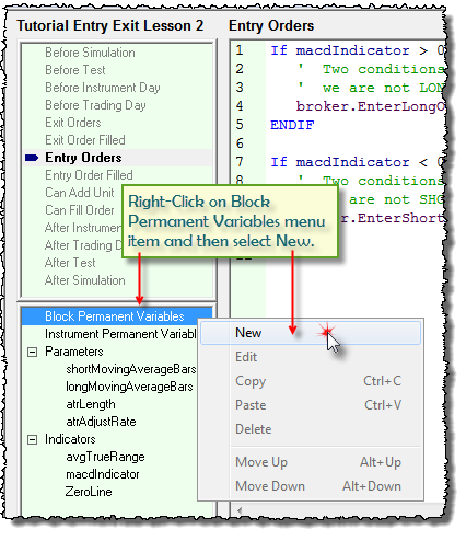 •Open the Blox Editor and click on the Entry Orders script section and select the New menu item to create a new Block Permanent Variable (BPV) Floating Point type variable:
