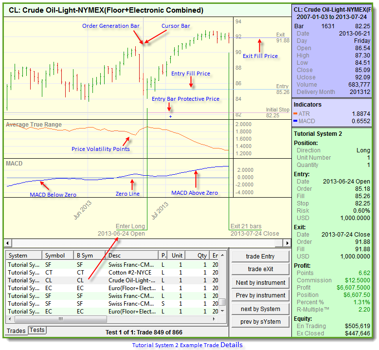 With the actual indicator and price values available it should be easy to understand how the rules are creating the timing and price values shown for each trade listed in the trade's table below the chart.