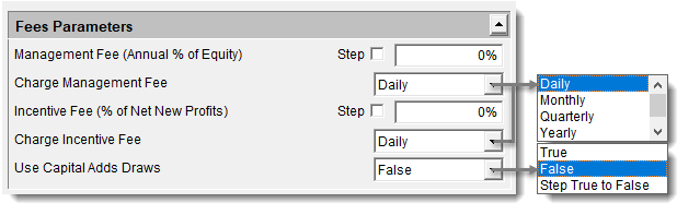 Global Parameter Fees will create a fee transactions based upon the Charge Management Fee selected setting. The amount of a fee event is applied at the end of a trade day off the current selected test date period. Fee transactions are applied as one of the last After Trade Day equity adjustments.