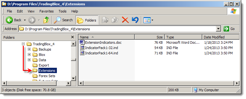 Indicator Pack extensions are placed in the Trading Blox Extension folder that is created when Trading Blox is installed. If you need to discover where the files are located or need to know where to place them, use this director image detail: