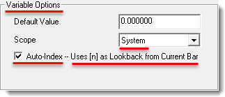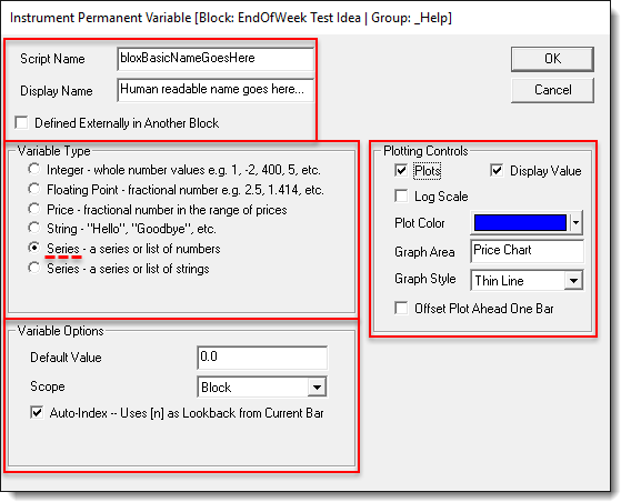 For both Block Permanent and Instrument Permanent, if you do not select Auto Index, you must specify a size for the array. This example, curentStopPrice, is an Auto Index series that plots in the Price Chart graph area in Red as Small Dots. |