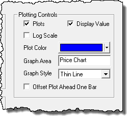 The Price Chart area is the default area where most of the plotted indicators are displayed. However, when the values being plotted are below or above the displayed price range of the chart, the plot be on the chart, but it won't be visible. To make it visible, create a text-name that is entered into the Graph Area field that will represent the plotted information so that Trading Blox Builder can create a sub-chart area in the chart display that will display the plot information that needs it own plotted range. |