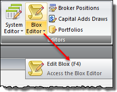 To get started, click the Blox Editor in the Editor Group menu button at the top of the main screen. When you click on the , and then use your mouse to click on the Blox item on the drop down menu to select. You can optionally use the F4 key on your keyboard, but some laptops require the Function-Key to use the F-Keys. Either way the Trading Blox Editor will appear: