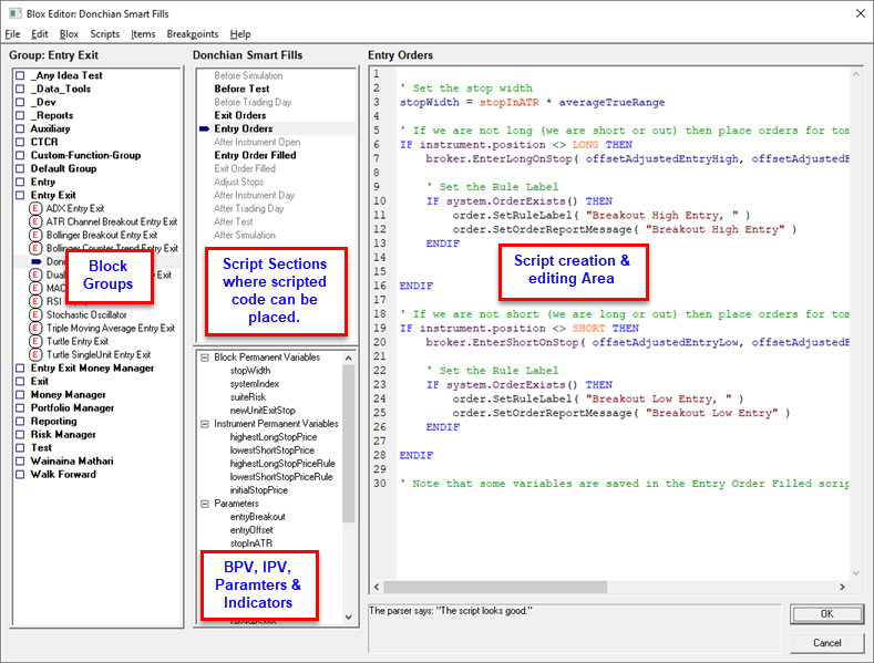 Trading Blox -- Blox Edtor will appear and show the Group Listing and available Blox modules on the left. In the center the selected Blox module's script sections will appear, and below the script sections will be the listings of the Block Permanent Variables, Instrument Permanent Variables types, then the, module's user parameters, and at the bottom the user created indicators: