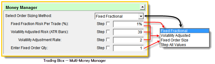 This module is useful during system development and as an all-around sizing module because it gives the trader the option of fixed quantity sizing to flush out the logic and calculation using a consistent order size. It can also be used during development when it might be important to see the performance differences of the three methods in a stepped method simulation.
