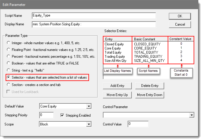 As each list item text is entered, Trading Blox Builder will create a matching Constant name. List item text names can have a space-character between each word. However, constant script-names cannot have a space characters. To provide similar appearing word, Trading Blox Builder will remove the space character between the words and place an underscore character so the constant name will appear similar to the List-Item name.