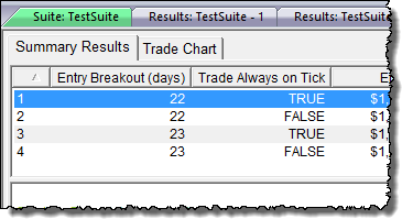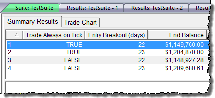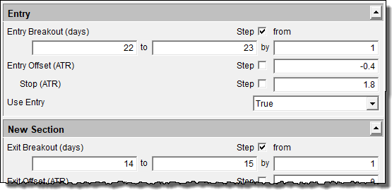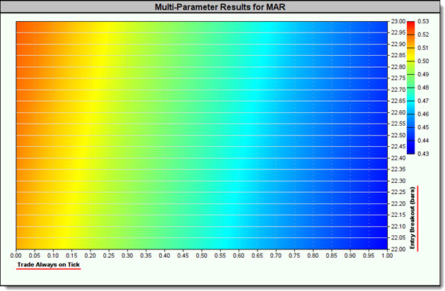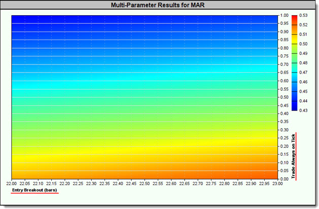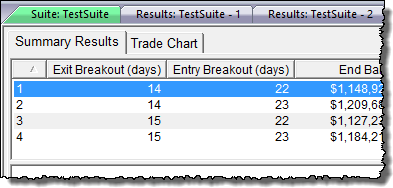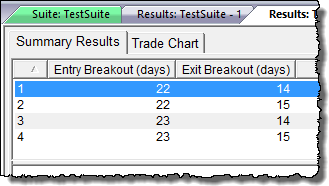 When the above test is run, the Entry Breakout (days) becomes the X-axis and the Exit Breakout (days) becomes the Y-axis. The Entry Breakout (days) is first, because it is the first parameter in the block, and its Stepping Priority is set to zero.