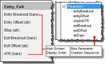 Trading Blox Builder parameter access screen follows the sequence of how the Parameters are arranged in their block. That value can be changed by the user when there is a need to create a Multi-Parameter Results Graph so the X & Y axis use the values from different parameters in the block.
