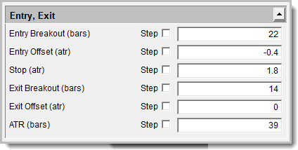 This first example of the Donchian System will step the first two parameters. Both have their Stepping Priority set to zero.