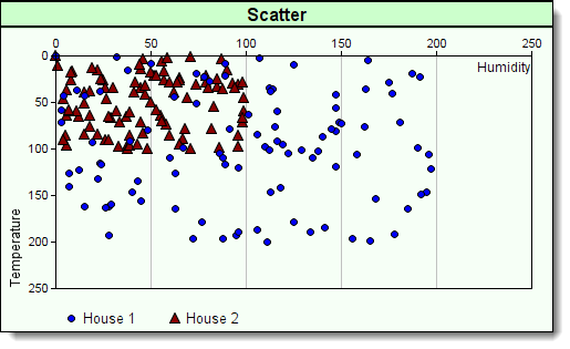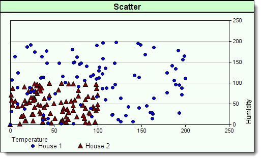 ' Place the X-Axis scale label "Temperature" in the left corner. ' Place the Y-Axis label "Humidity" in the lower right corner. chart.SetAxisTitles("Temperature","Humidity") ' Place the series of 100 dots positioned at element coordinates ' x & y using the BPV "Randomx" element values. chart.AddScatter(AsSeries( randomx ),AsSeries( randomy ), iNumber, 7, 6 ) ' Place the series of 100 dots positioned at element coordinates ' x & y using the BPV "House2x" element values. chart.AddScatter(AsSeries( house2x ),AsSeries( house2y ), iNumber, 3, 10 ) ' Create & Save this new chart as a file. ' Always add a backSlash Character after "resultsReportPath" chart.Make(test.resultsReportPath+"\"+"Scatter.png")
