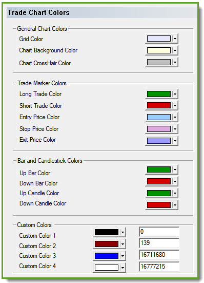 Note:If you use one of the custom colors from Preferences' Trade Chart Colors section, the user will be able to modify the colors as desired by change the color associated with a color name.